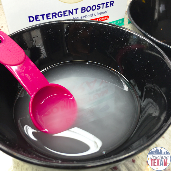 Start by adding the warm water to a bowl. Be sure the water is quite warm or the borax will not dissolve properly.