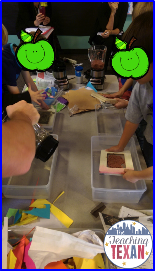 If you’d like to re-create this activity in your classroom you’ll need: scrap paper (construction paper, cardstock, newspaper, magazines, etc), a blender, felt, sponges, 2 $1 frames from Michael’s, screen (can purchase at Home Depot or Lowes), tubs filled halfway with water (big enough to submerge the frames).
