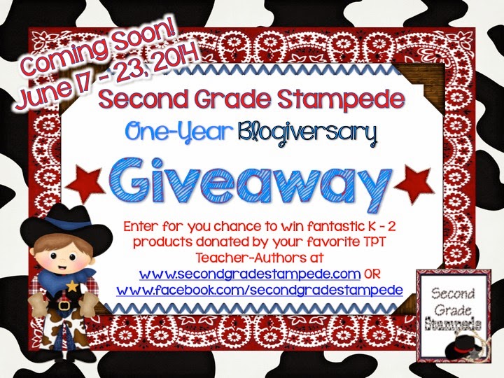 In celebration of Second Grade Stampede’s one-year Blogiversary, I will be hosting a GIVEAWAY! The giveaway will feature several products donated by fantastic TPT Teacher-Authors, as well as several products that I have created. The Blogiversary giveaway will take place June 17 – 23, 2014. Check back to enter for your chance to win some great products geared towards K – 2 teachers.