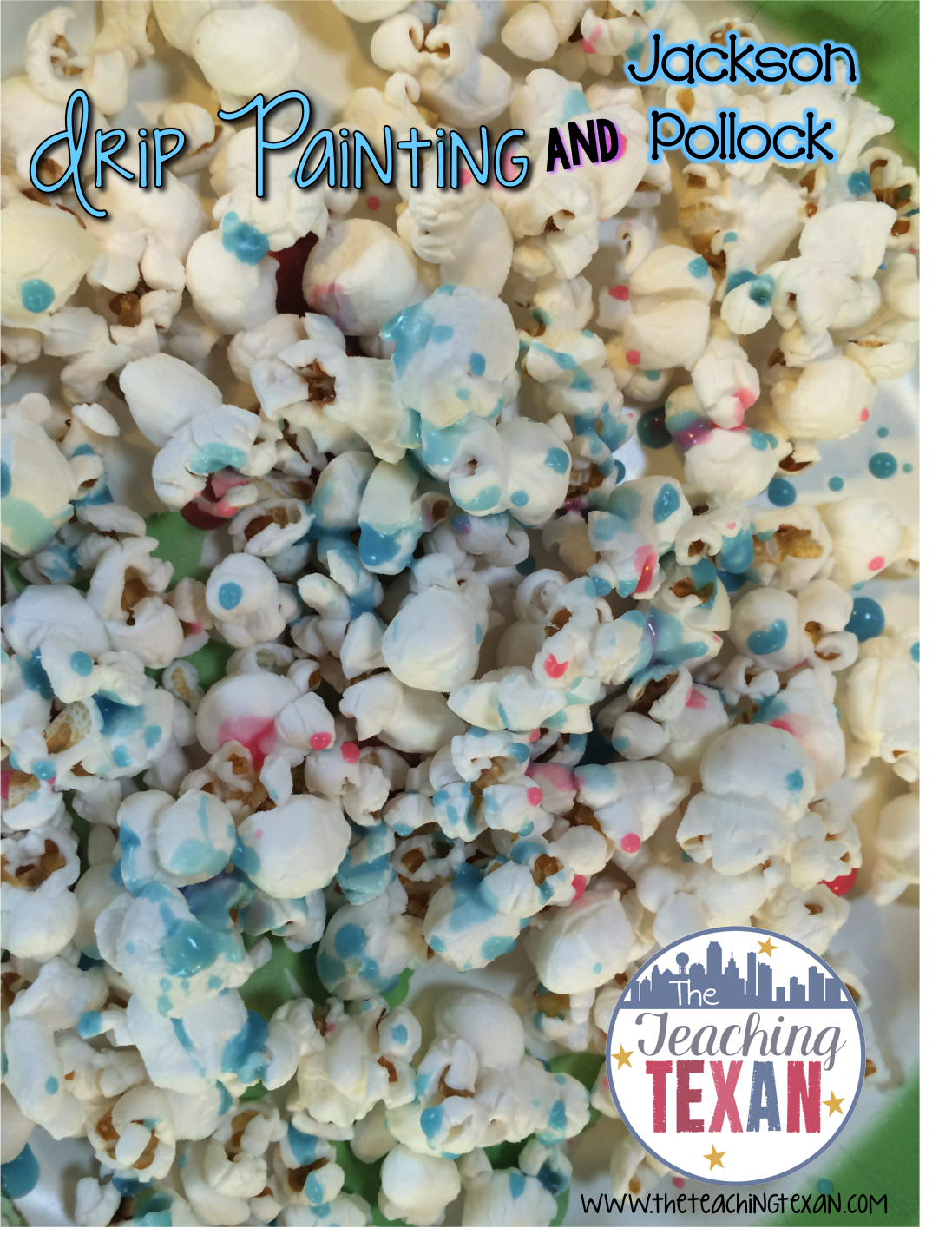 Jackson Pollock is known for his drip style of painting. I thought it would be fun to have the kiddos try their hand at drip painting using icing and popcorn! To make the icing, use powdered sugar and add water until you get a smooth consistency (a little more on the liquid side makes the drip painting easier). We used 4 cups of powdered sugar and probably 1/2 cup of water and that was more than enough for 20 kiddos!