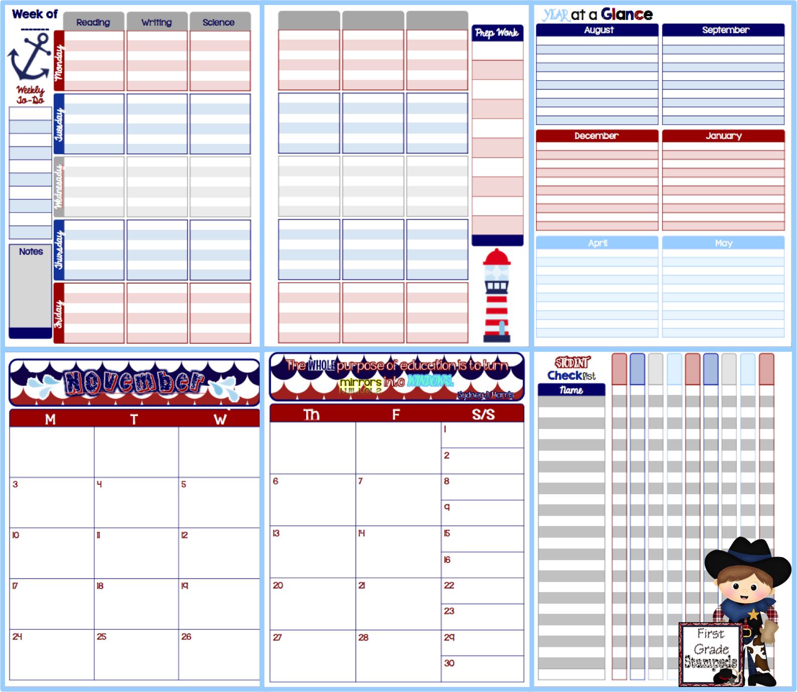 So, I thought I’d just go with another Erin Condren planner, but I couldn’t bring myself to pay that price tag again. On top of that I’ve read some not so good reviews about the company lately. Anyway, I also knew that I wanted the planner to fit my new, nautical classroom theme. The result… I have been working on my own planner for a bit now! My goal is to have it finished and printed/bound by Friday!